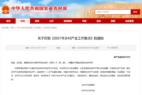 關(guān)于印發(fā)《2021年鄉(xiāng)村產(chǎn)業(yè)工作要點》的通知
