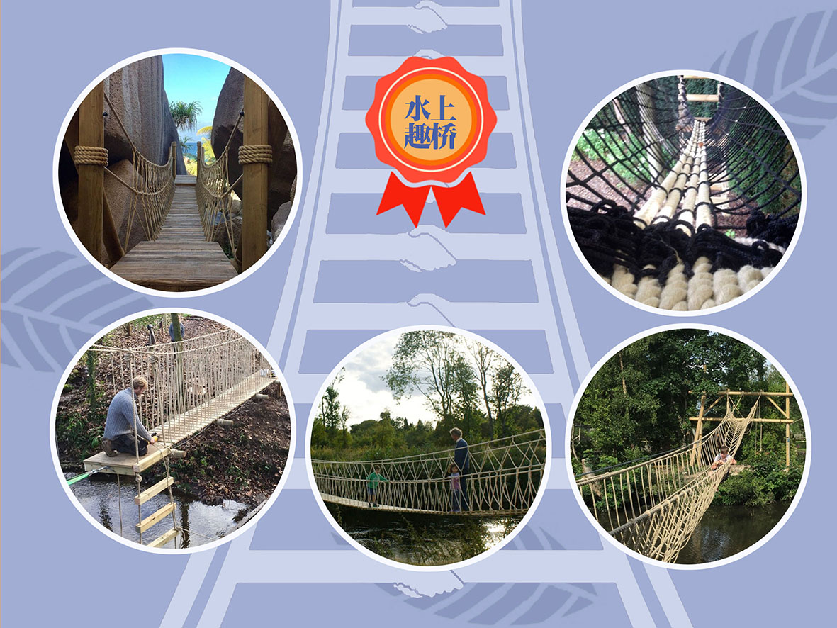 水上趣橋項(xiàng)目是在寧?kù)o的河面上建起一座座有趣、橋體造型各異的小橋連接兩岸,使得此區(qū)域的游樂(lè)性能大增,其游樂(lè)焦點(diǎn)除了在色彩、造形上給人耳目一新的感覺(jué)外,水上趣橋的特點(diǎn)是游人參與性強(qiáng),過(guò)橋的難易程度很具挑戰(zhàn)性,有令人恐高的五環(huán)橋;也有集體力、平衡力于一體的吊樁橋;有嘗試體形靈活性的鉆圈橋;也有意義獨(dú)具的要雙人攜手才能過(guò)的情侶橋等等,對(duì)不同年齡、興趣、膽量的人都有極高吸引力,并且名稱的設(shè)計(jì)具有獨(dú)特的含義,水上趣橋是每一處有水面的場(chǎng)地必備橋類項(xiàng)目。