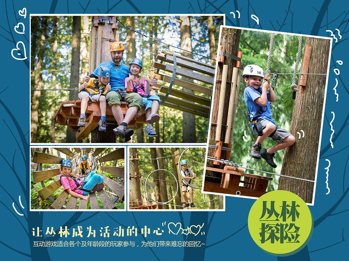 叢林探險(xiǎn)(樹(shù)上探險(xiǎn))項(xiàng)目是在大樹(shù)之間設(shè)置的運(yùn)動(dòng)繩索、軟橋或繩網(wǎng)等有挑戰(zhàn)的項(xiàng)目,使人們?cè)诶K網(wǎng)上搖擺和嬉戲,或者通過(guò)從一棵樹(shù)到另一棵樹(shù)上擺動(dòng)的吊橋。